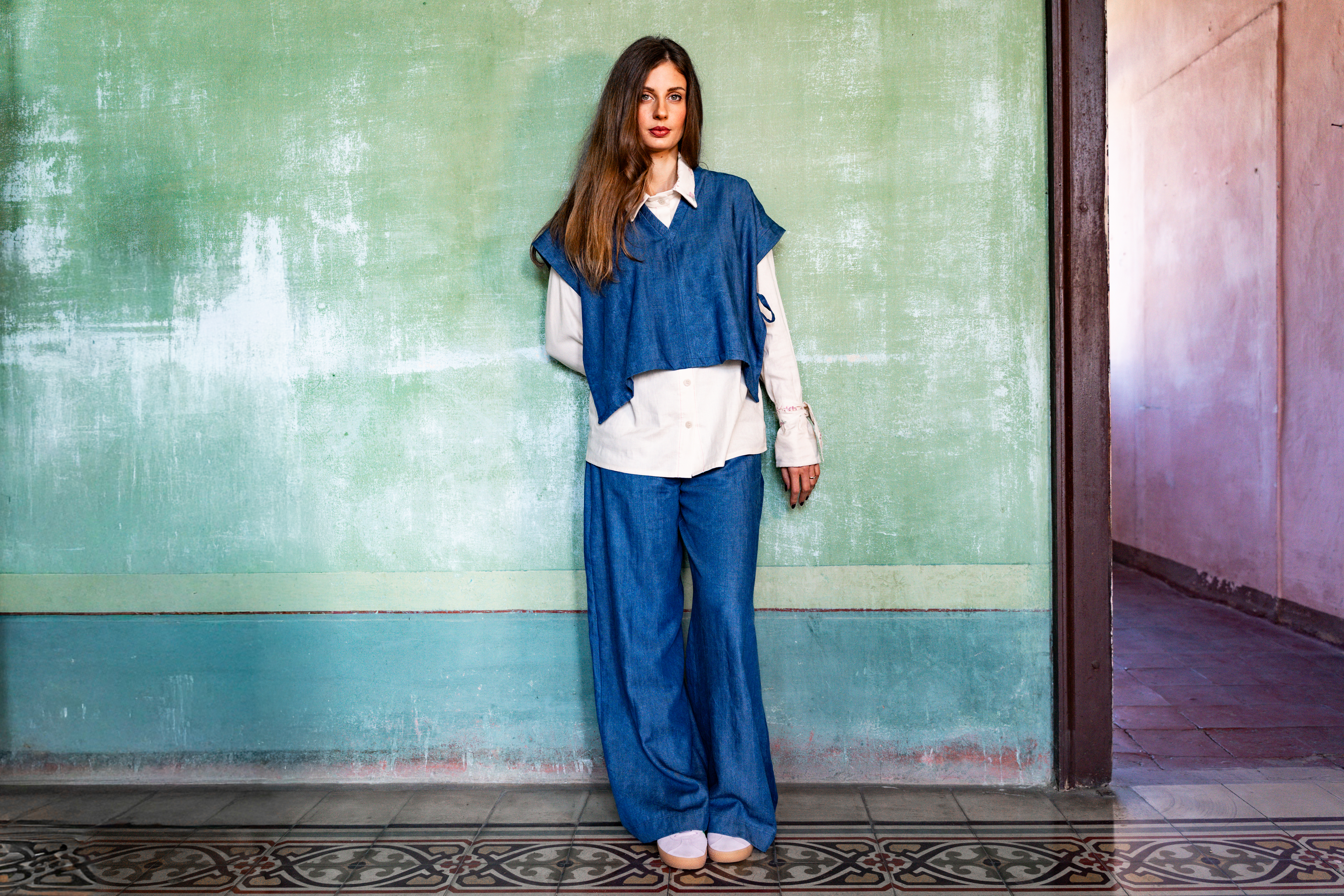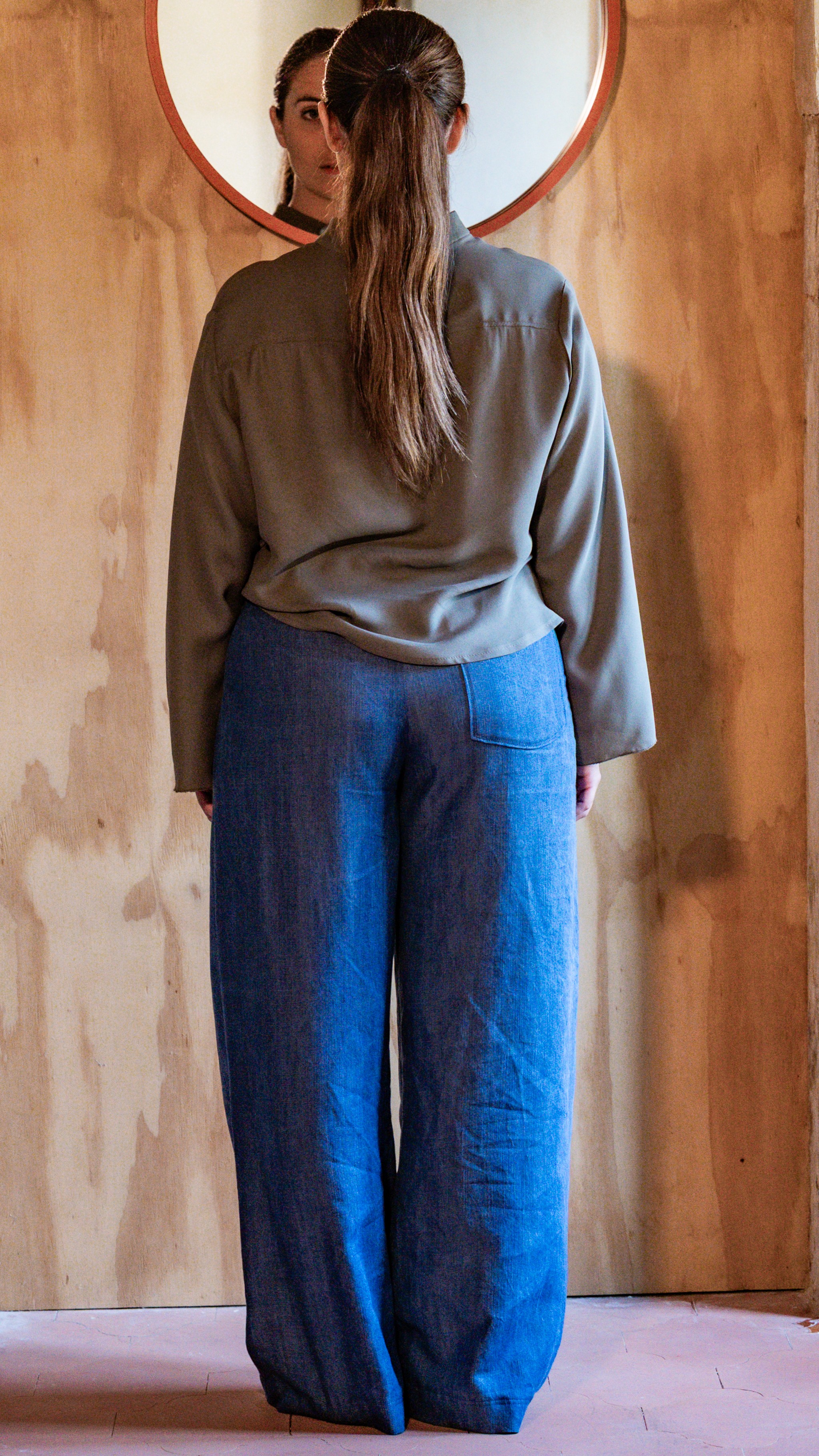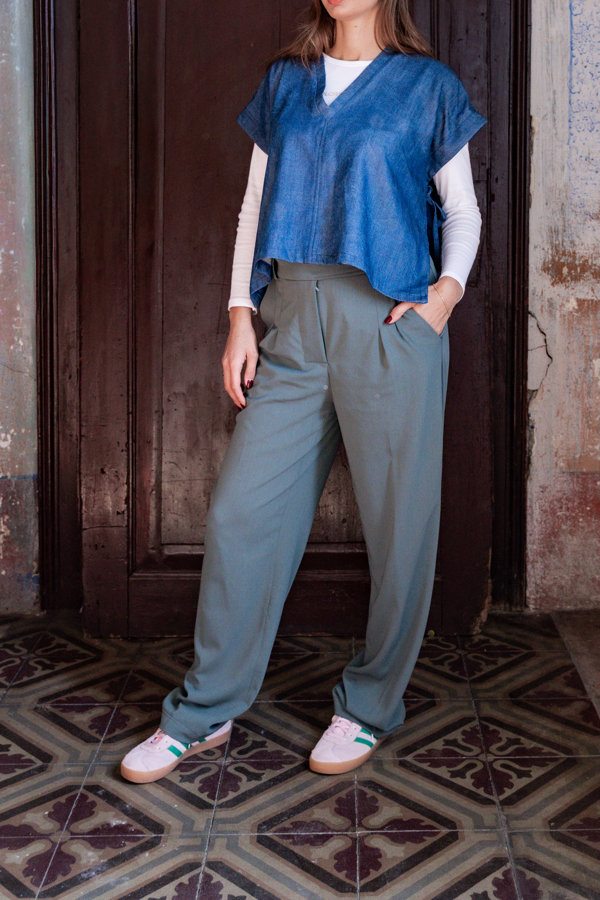 Vestibilità: pantalone a palazzo, con tasca applicata su retro e chiusura sul centro davanti con doppio bottone da entrambi i lati.
