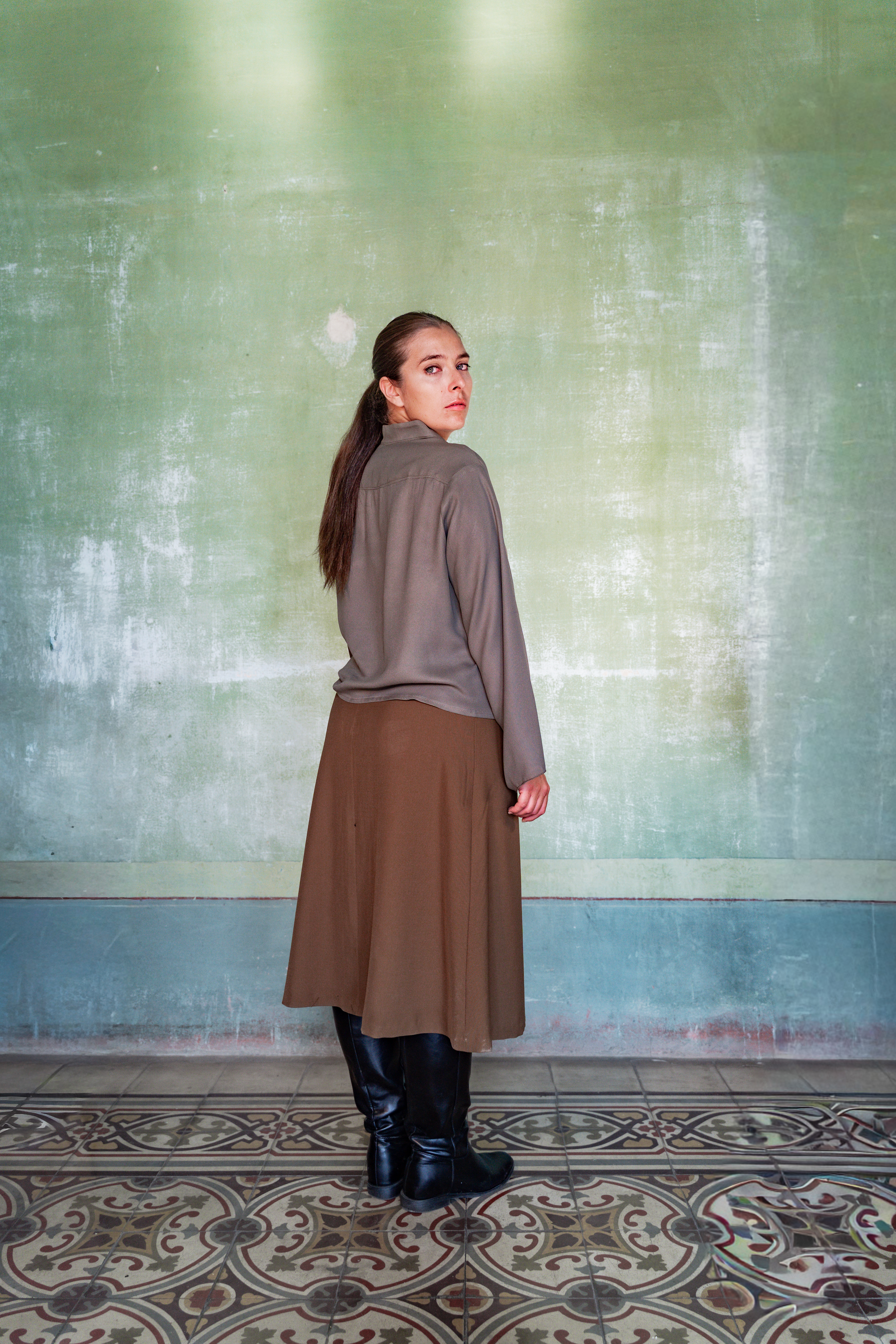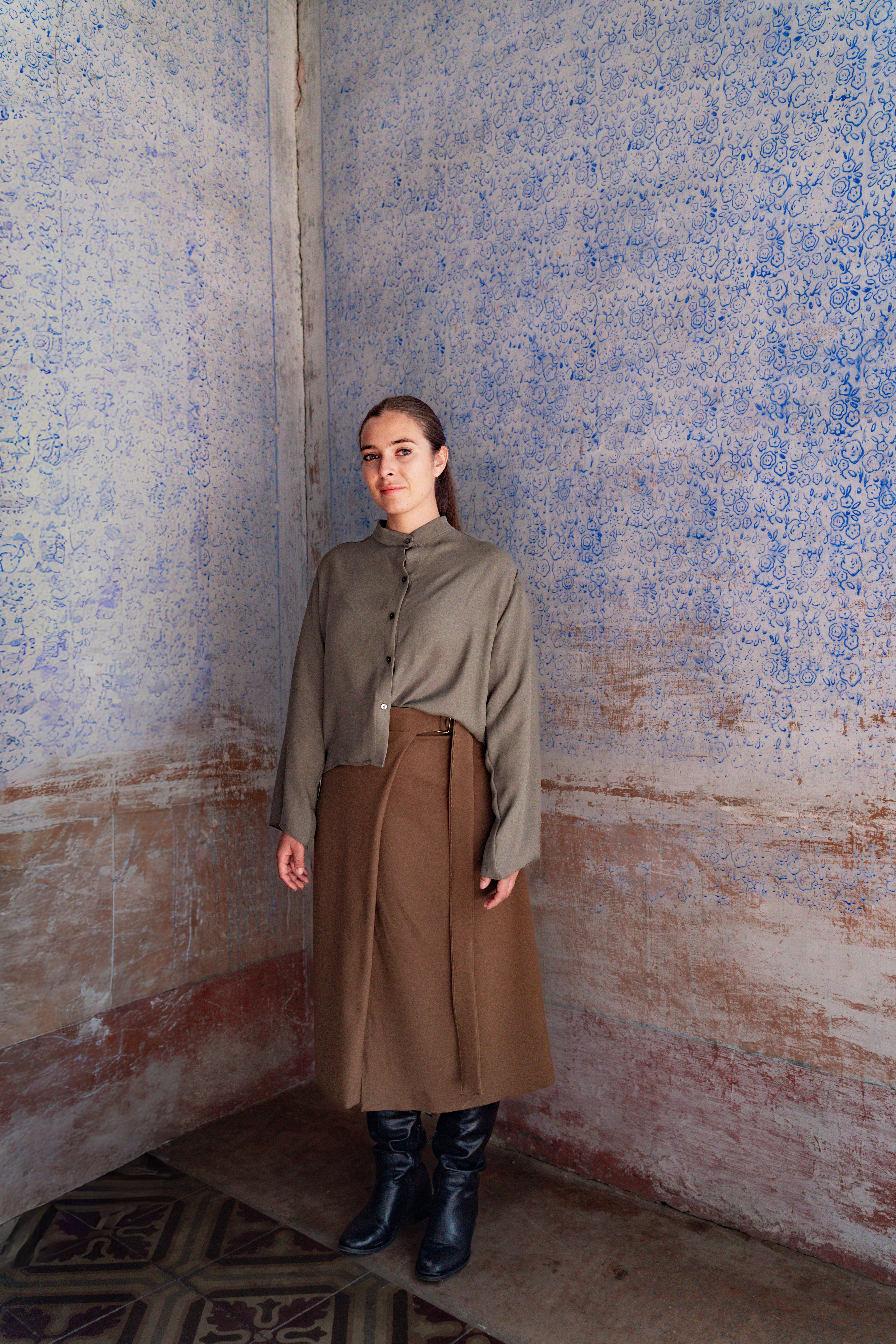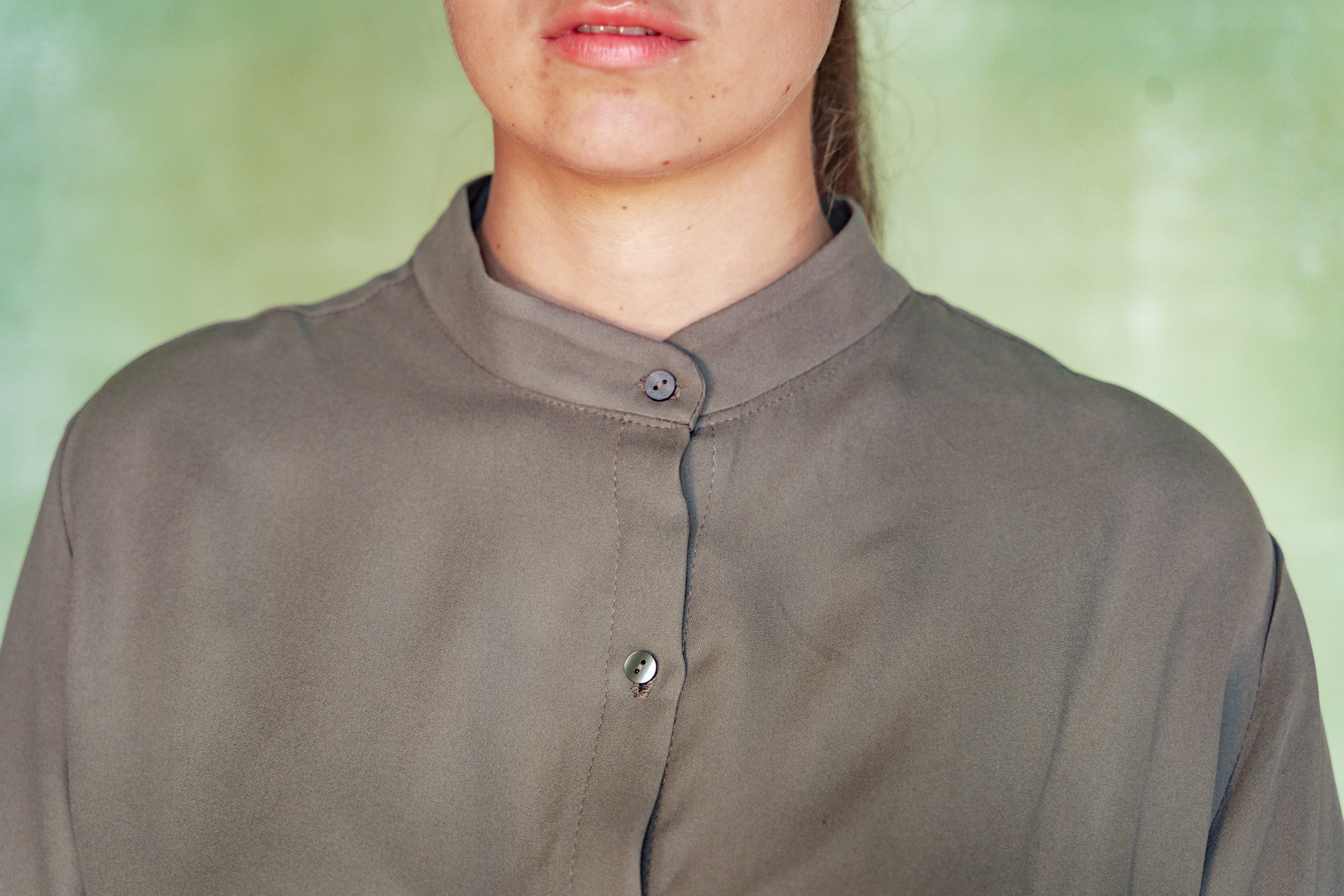Vestibilità: camicia morbida, dalla manica ampia. Collo alla coreana.