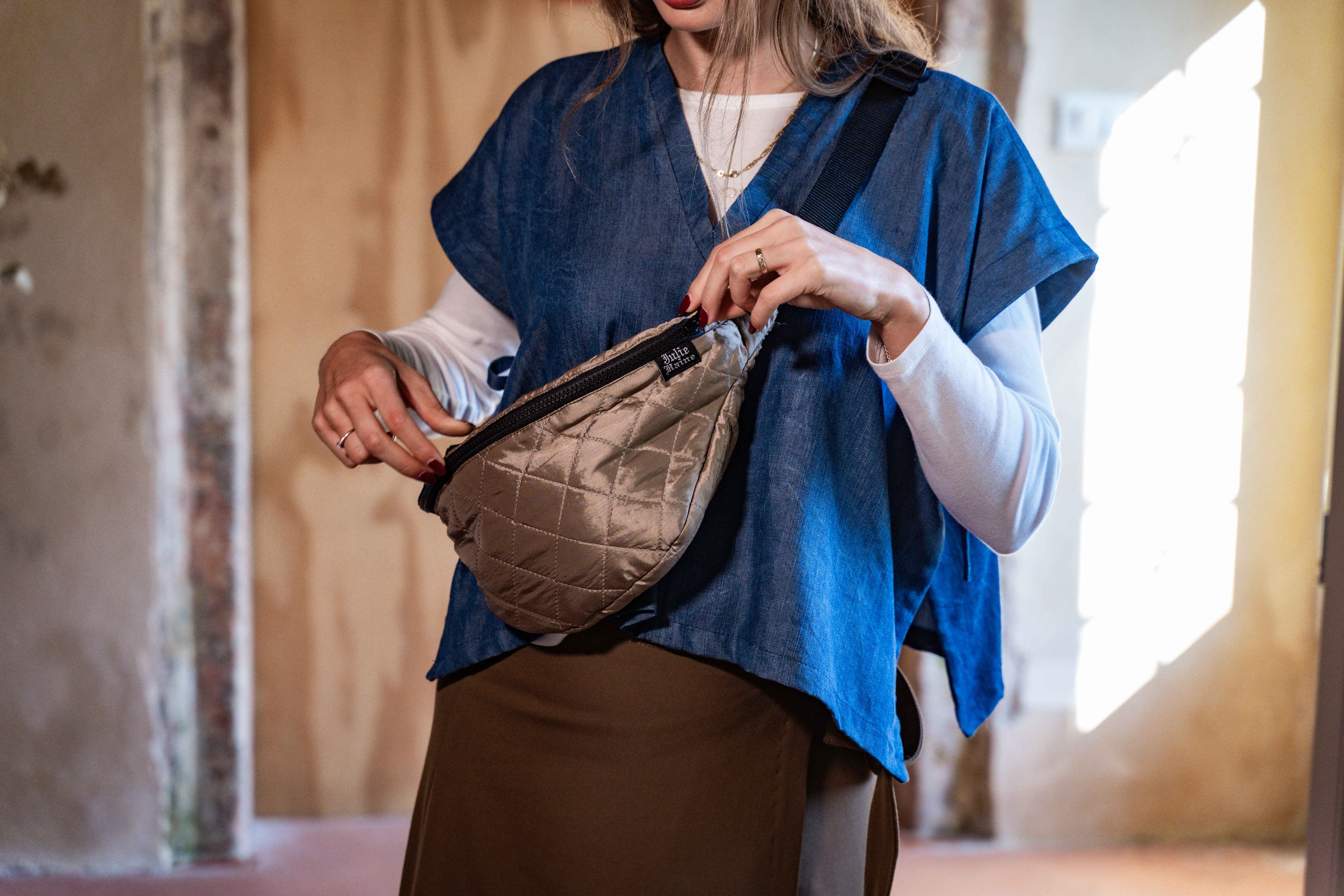 Questa Capsule vede la presentazione di un’altra collaborazione: il marsupio realizzato con la mia amica JulieHaine. Con il suo design, e dei tessuti che ho salvato da un vecchio laboratorio, abbiamo creato questo accessorio comodissimo, capiente e con una forte personalità.